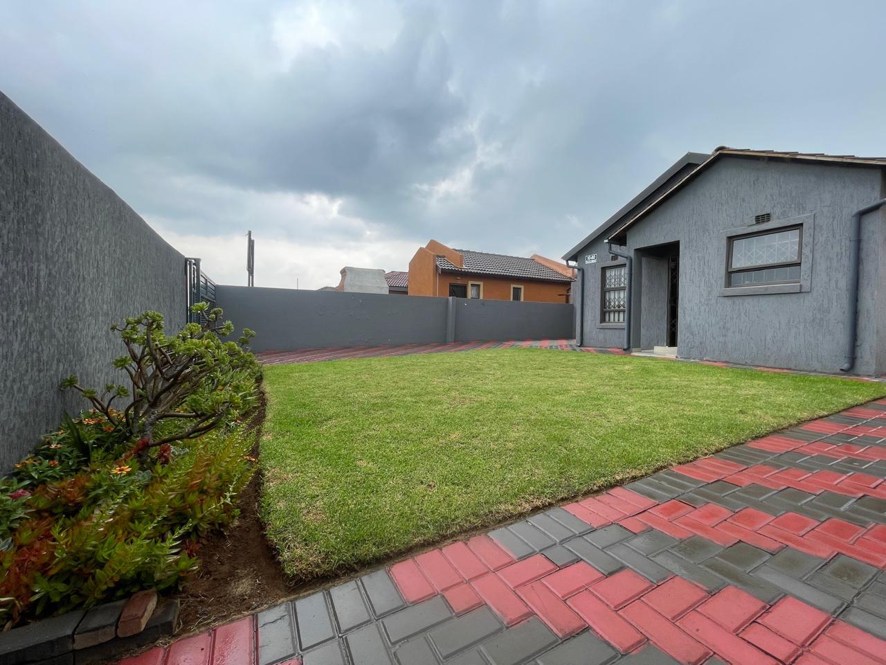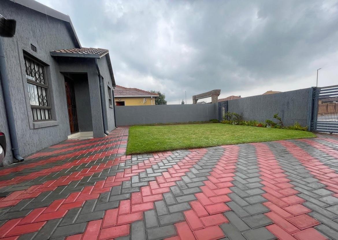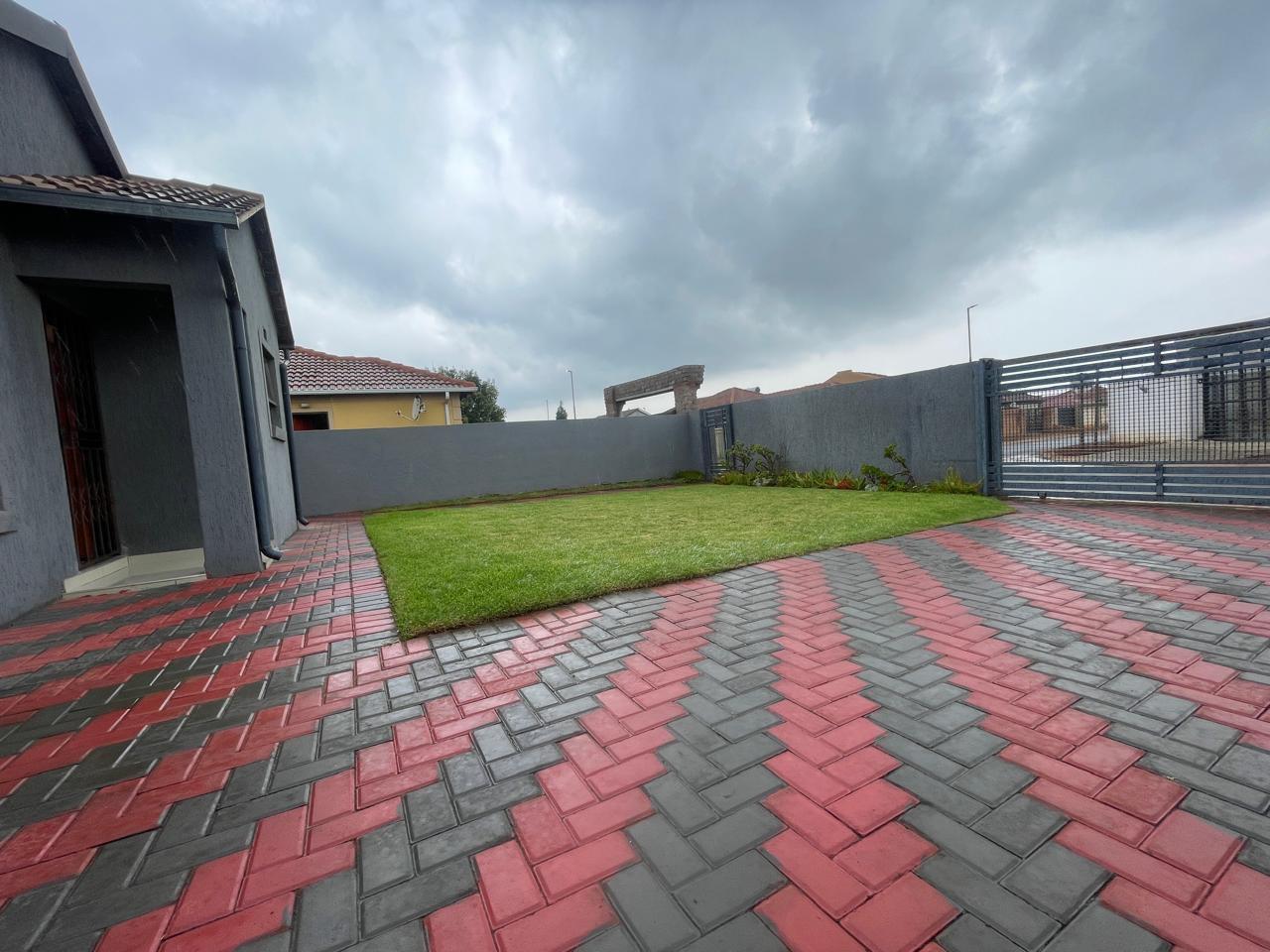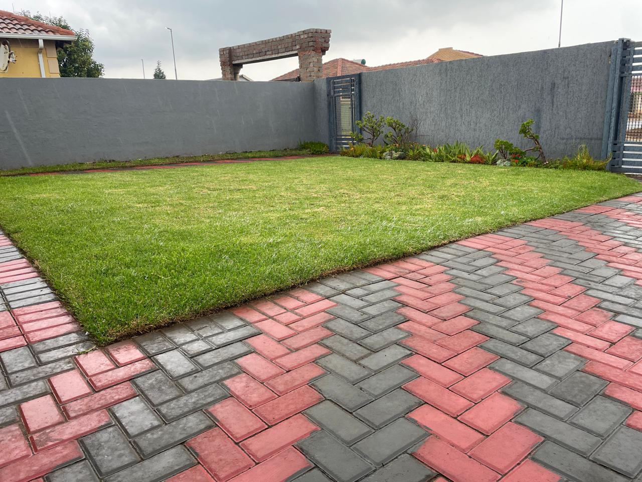 The property boasts a striking curb appeal with its contemporary dark grey façade, accented by clean architectural lines. A neatly paved walkway with a red and charcoal brick pattern leads to the entrance, adding a stylish touch to the well-manicured lawn. The surrounding boundary walls provide privacy and security, making this an ideal space for relaxation or entertaining.