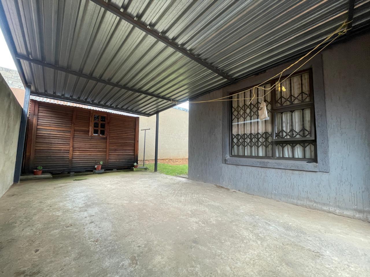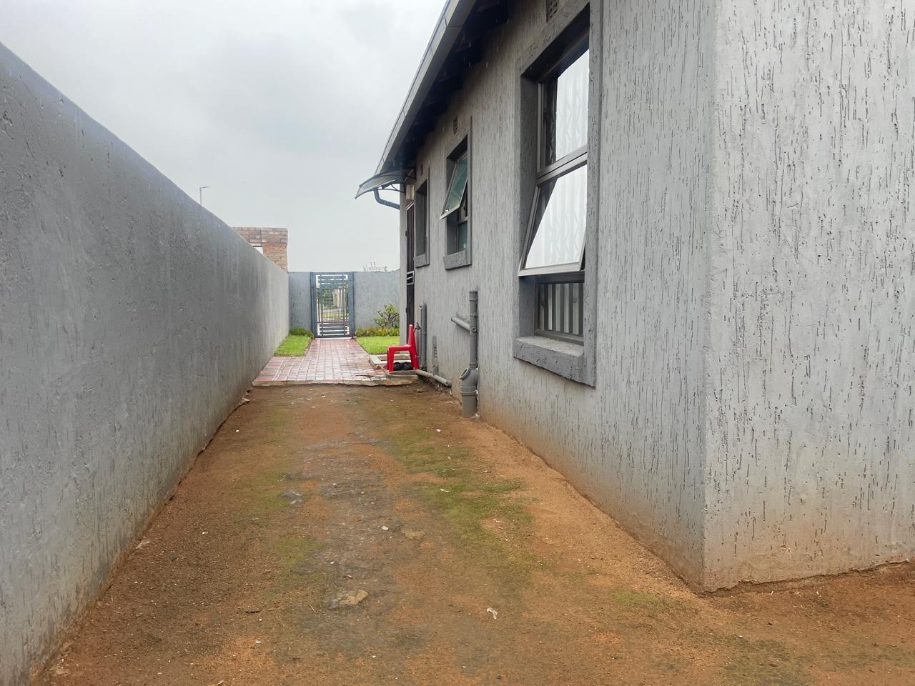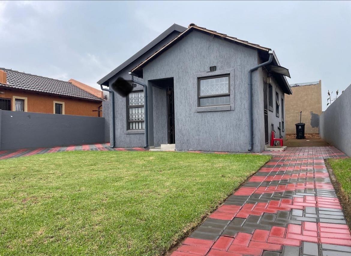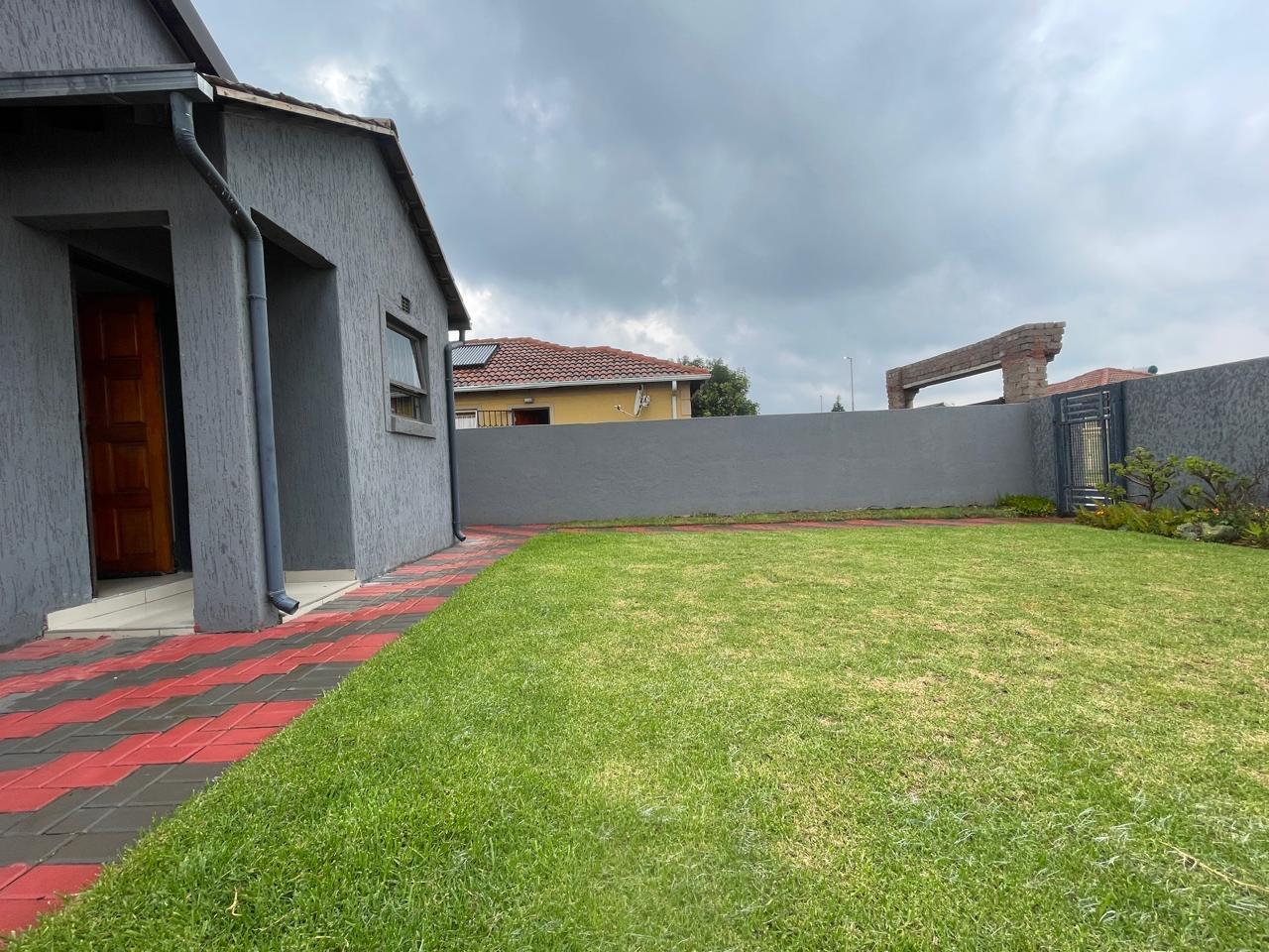 The property boasts a striking curb appeal with its contemporary dark grey façade, accented by clean architectural lines. A neatly paved walkway with a red and charcoal brick pattern leads to the entrance, adding a stylish touch to the well-manicured lawn. The surrounding boundary walls provide privacy and security, making this an ideal space for relaxation or entertaining.