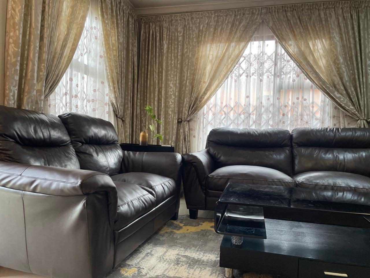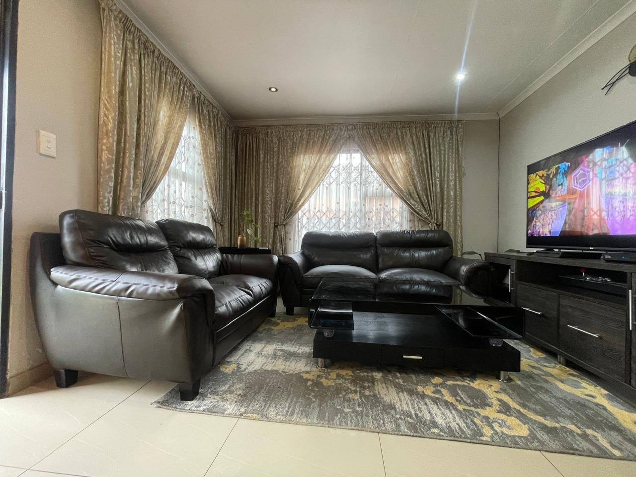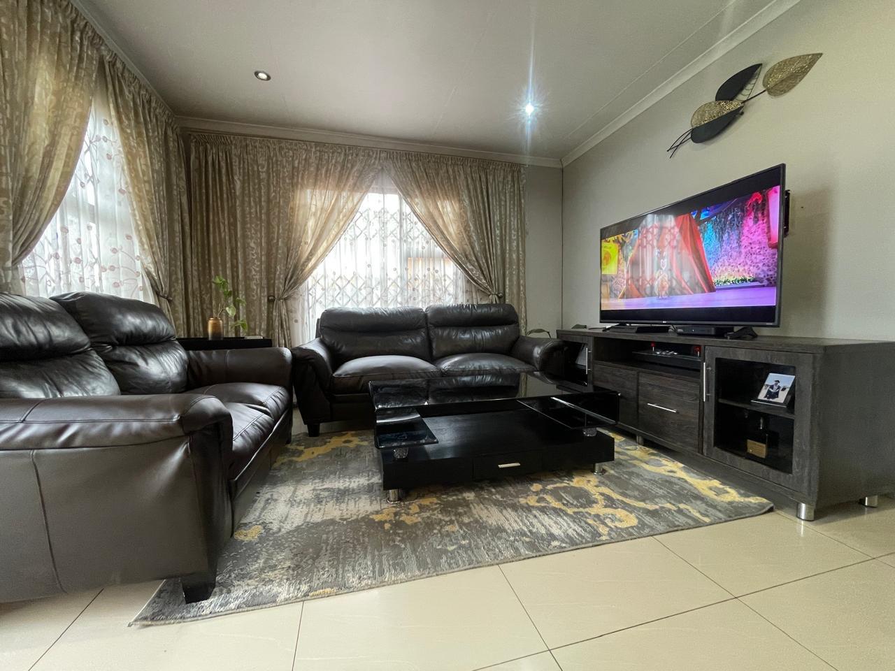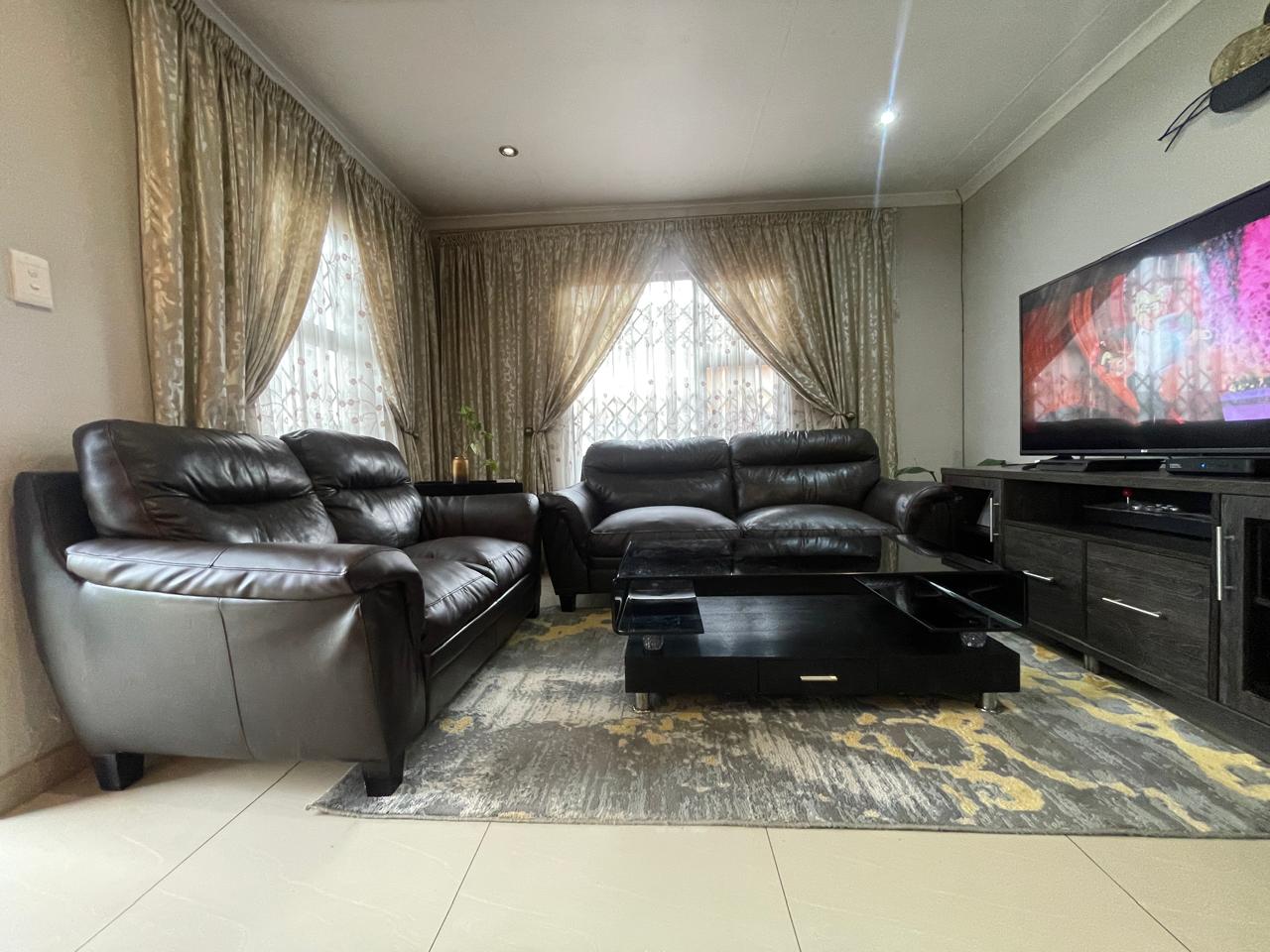 Step inside to discover an inviting living area adorned with warm, neutral tones. The spacious lounge features stylish décor, and large windows with elegant drapery that allow for natural light while maintaining privacy. The open-plan design seamlessly connects to the dining and kitchen area, creating a welcoming atmosphere for family and guests.