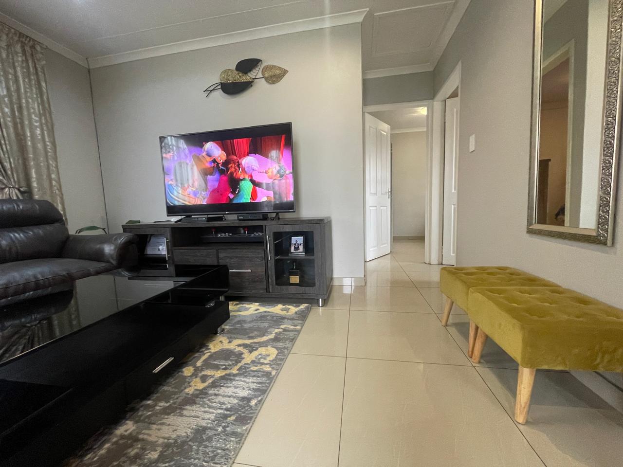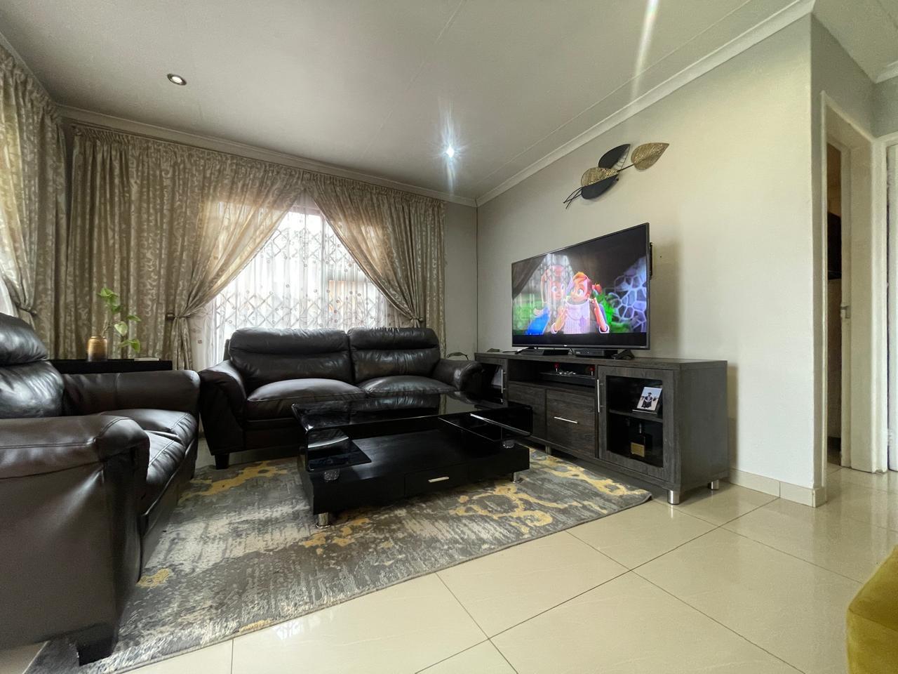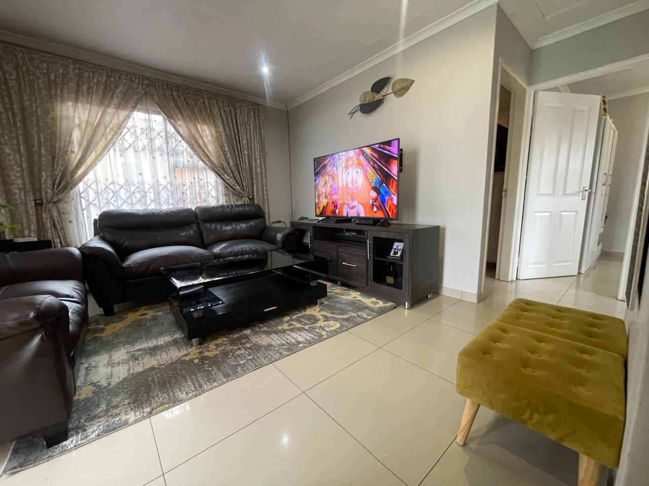 Step inside to discover an inviting living area adorned with warm, neutral tones. The spacious lounge features stylish décor, and large windows with elegant drapery that allow for natural light while maintaining privacy. The open-plan design seamlessly connects to the dining and kitchen area, creating a welcoming atmosphere for family and guests.