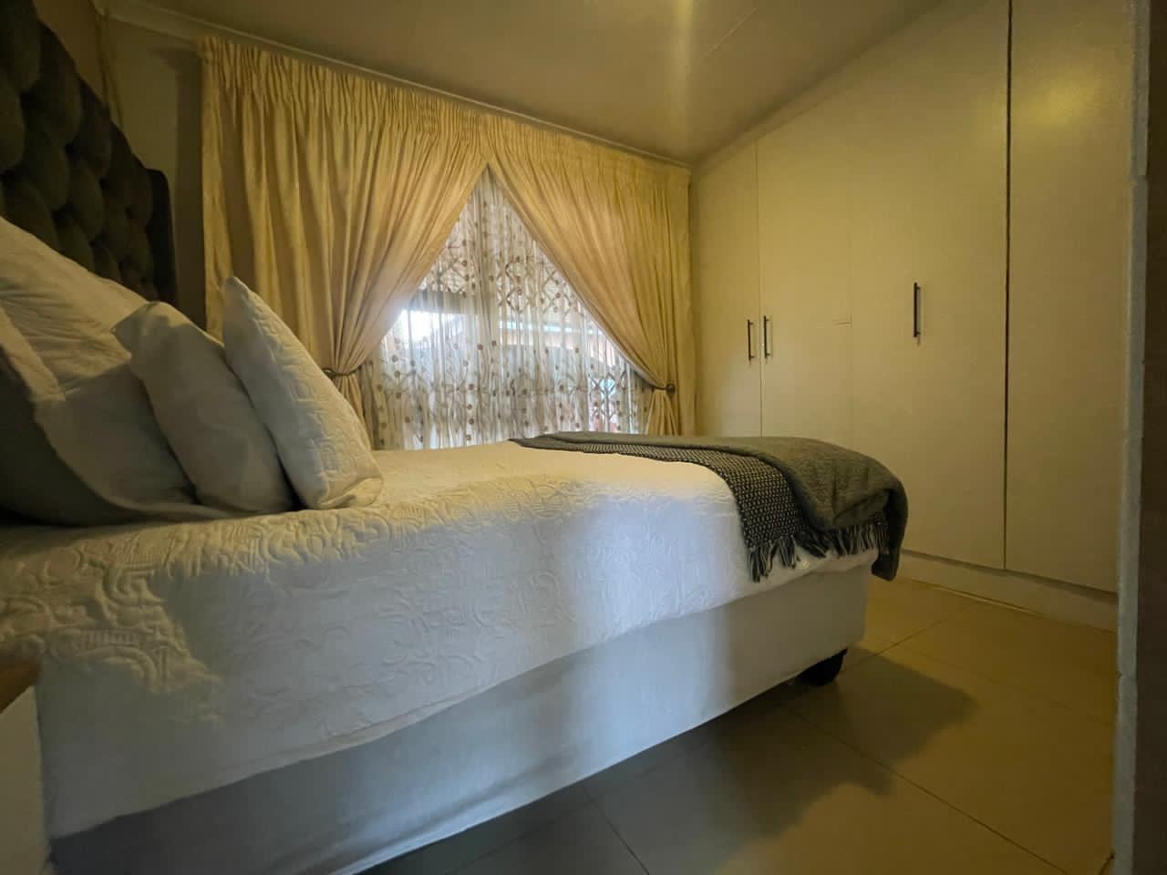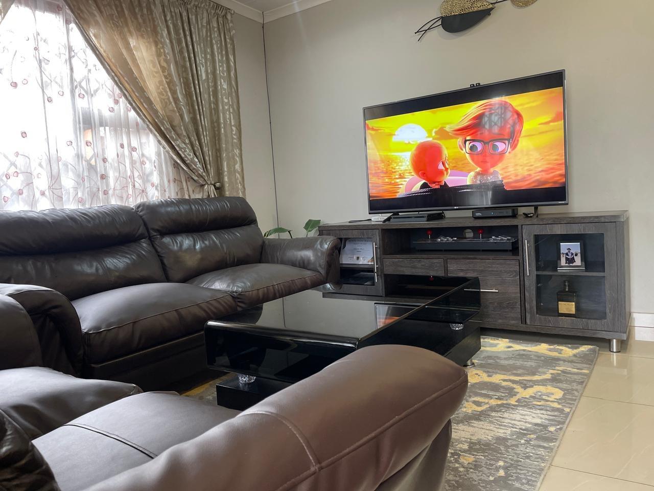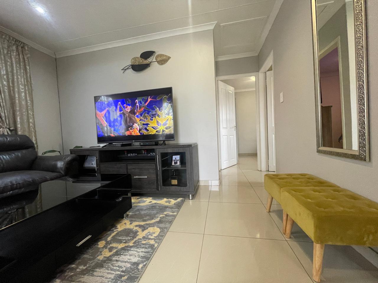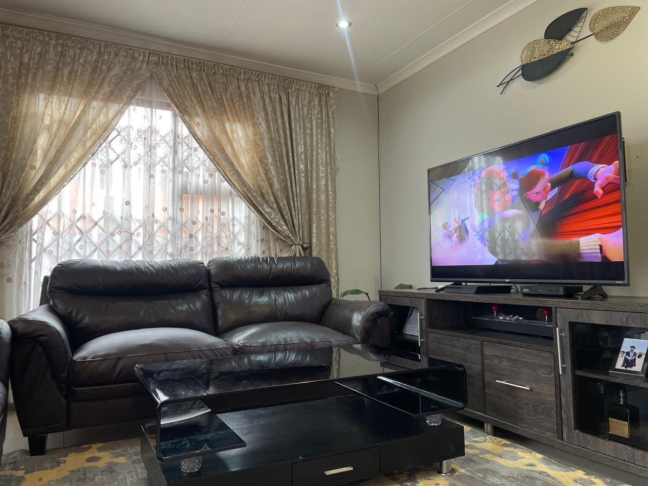 Step inside to discover an inviting living area adorned with warm, neutral tones. The spacious lounge features stylish décor, and large windows with elegant drapery that allow for natural light while maintaining privacy. The open-plan design seamlessly connects to the dining and kitchen area, creating a welcoming atmosphere for family and guests.