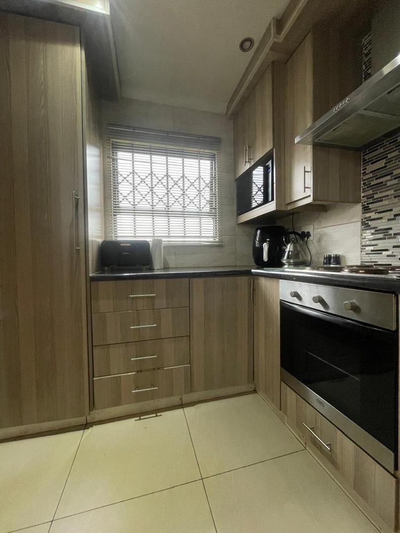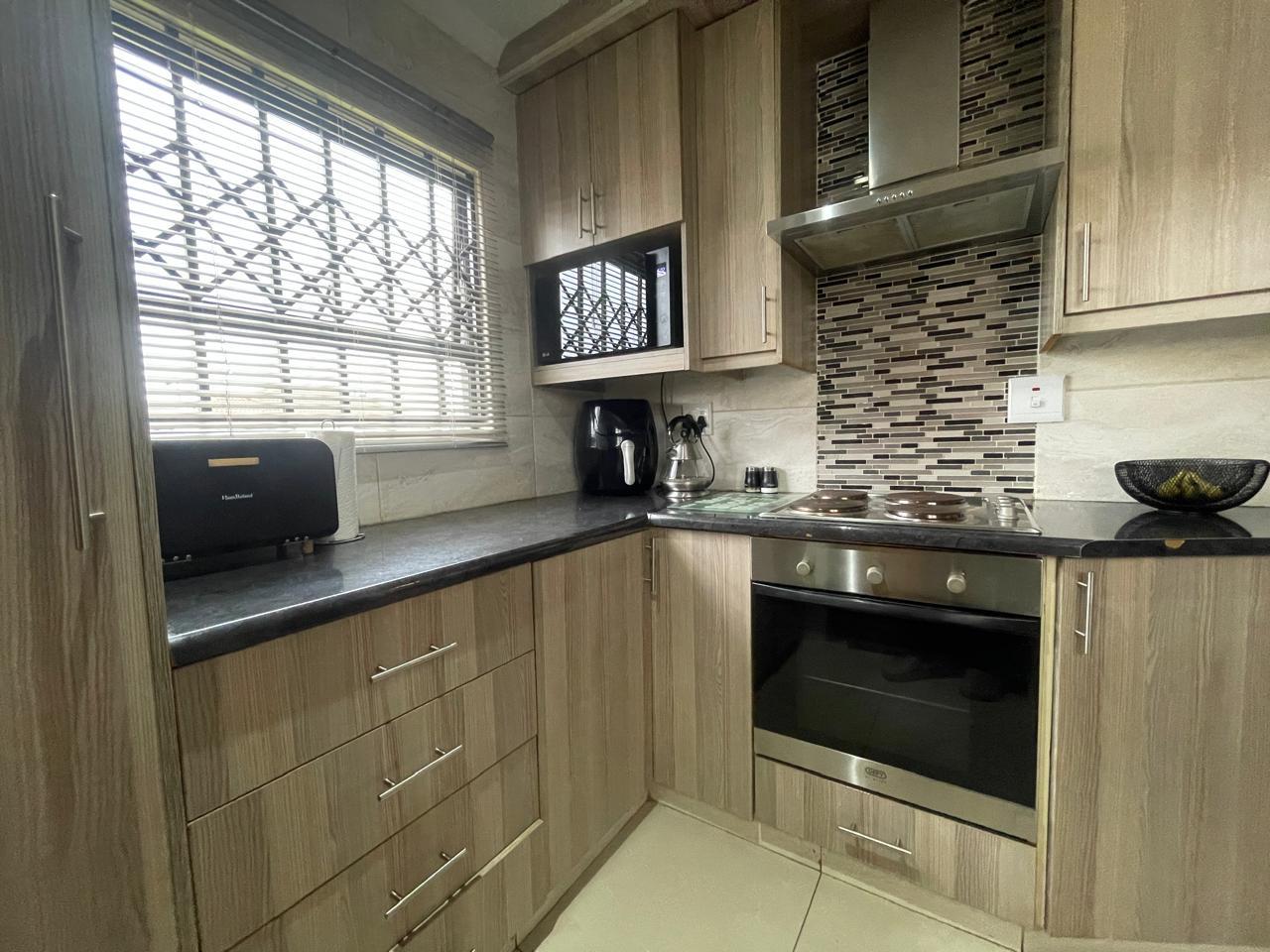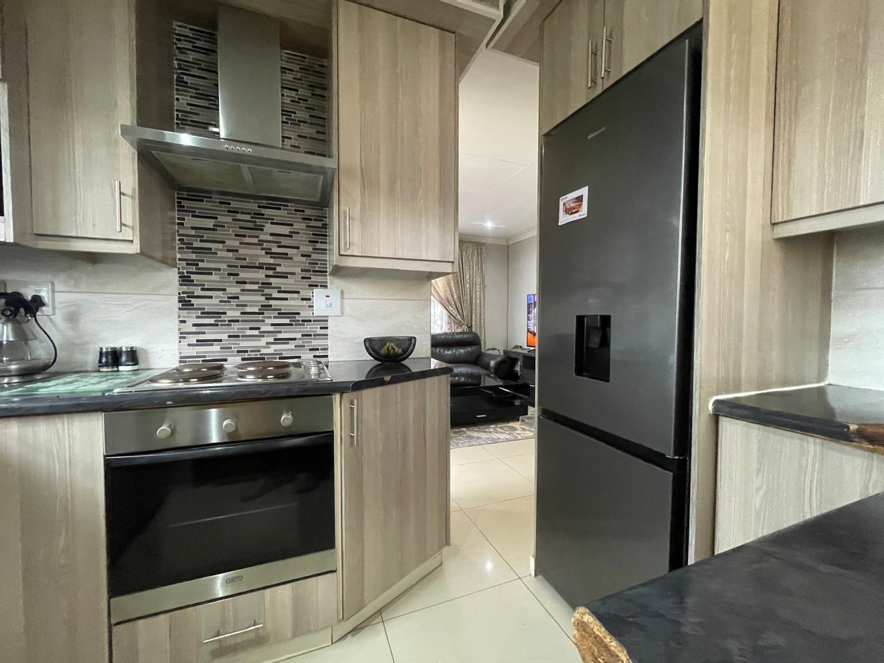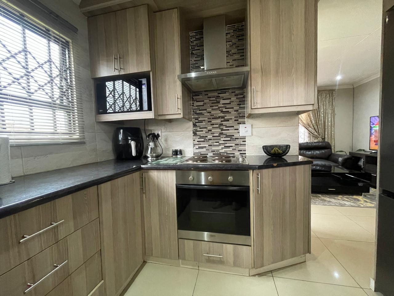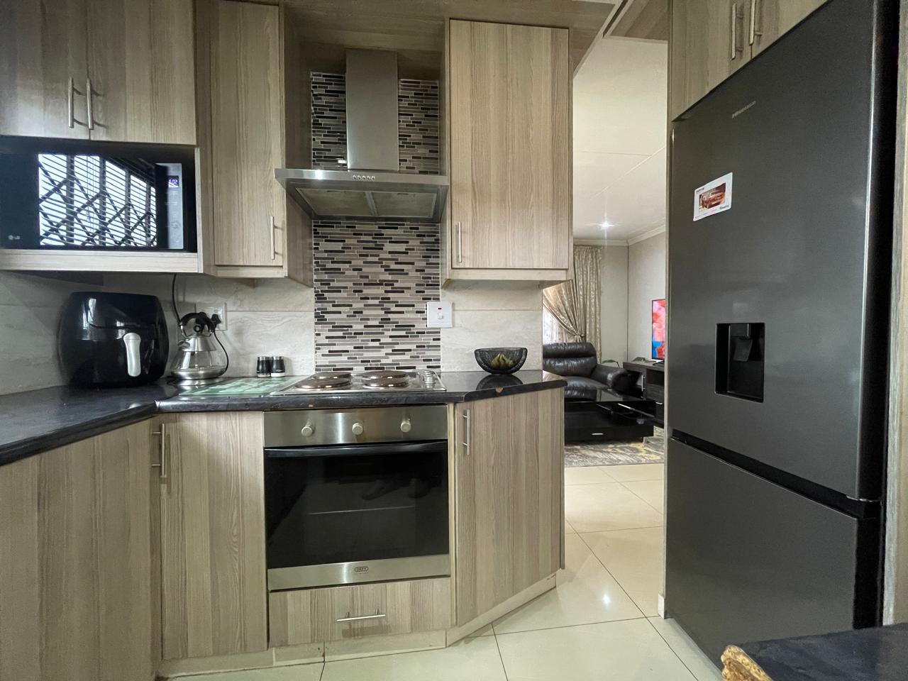 The kitchen is a highlight of this home, boasting modern wood-finish cabinetry, sleek black countertops, and a high-end backsplash that adds a touch of sophistication. Equipped with a built-in oven, stovetop, and an extractor fan, this kitchen is designed for both functionality and style. Space for a double-door refrigerator and ample storage space complete the setup, making meal prep effortless.