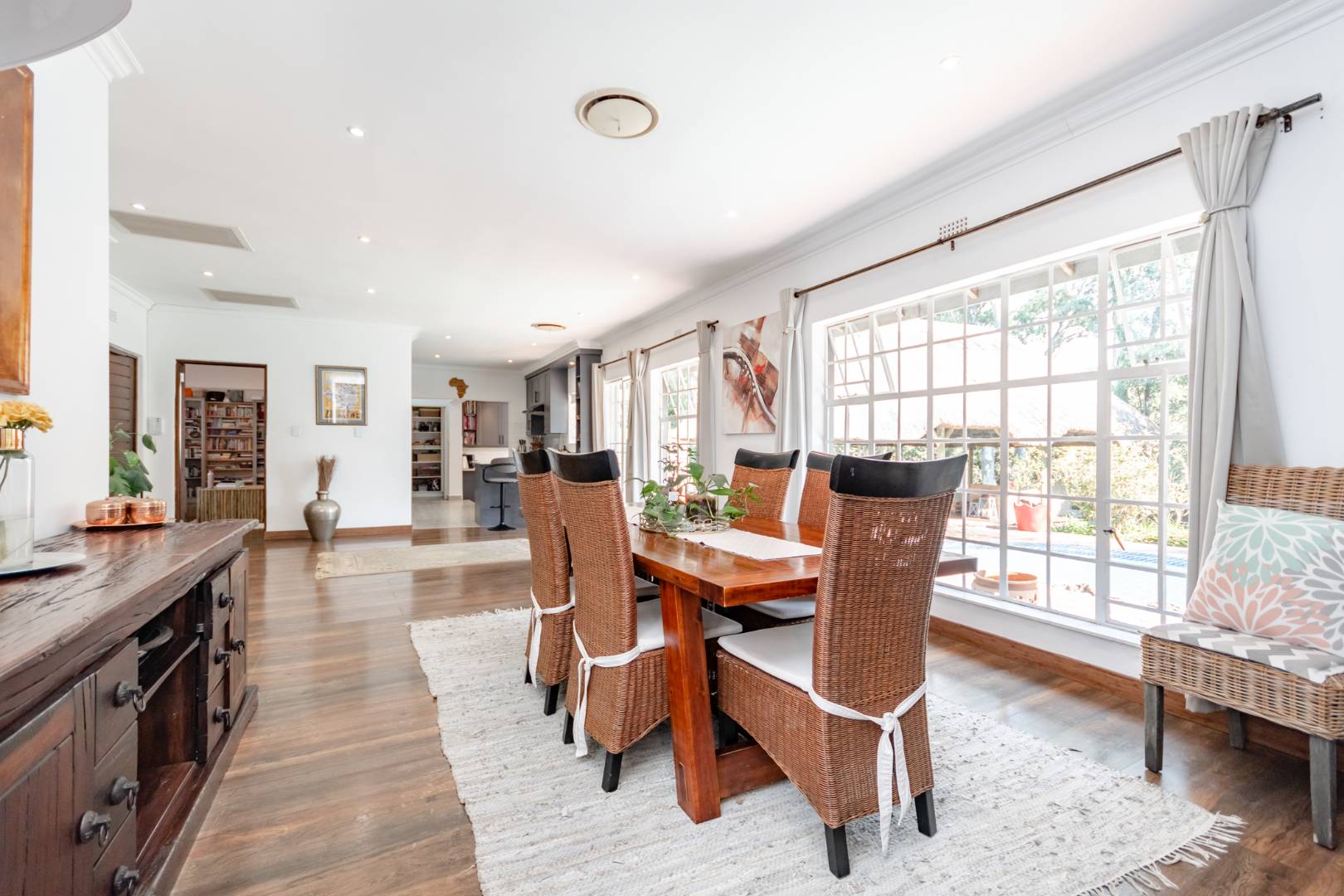 As you move from the kitchen , you find yourself in the middle of the 1st living area which is perfect for dining experiences with family and friends.The living room overlooks the property's rich and lush green-garden with a generously sized pool for your warm and sunny days.