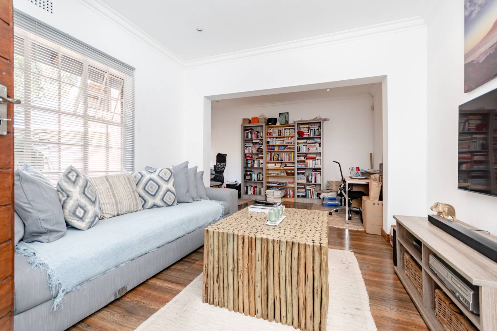 The 2nd living room leads into a quaint sun-room that looks into the rest of the backyard with doors that open up to the pool area and lapa.